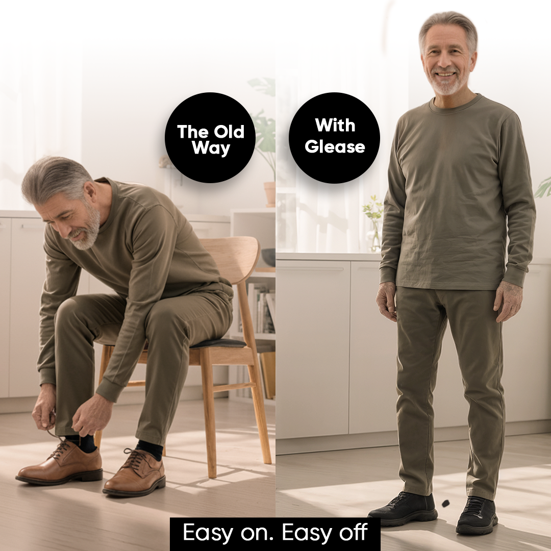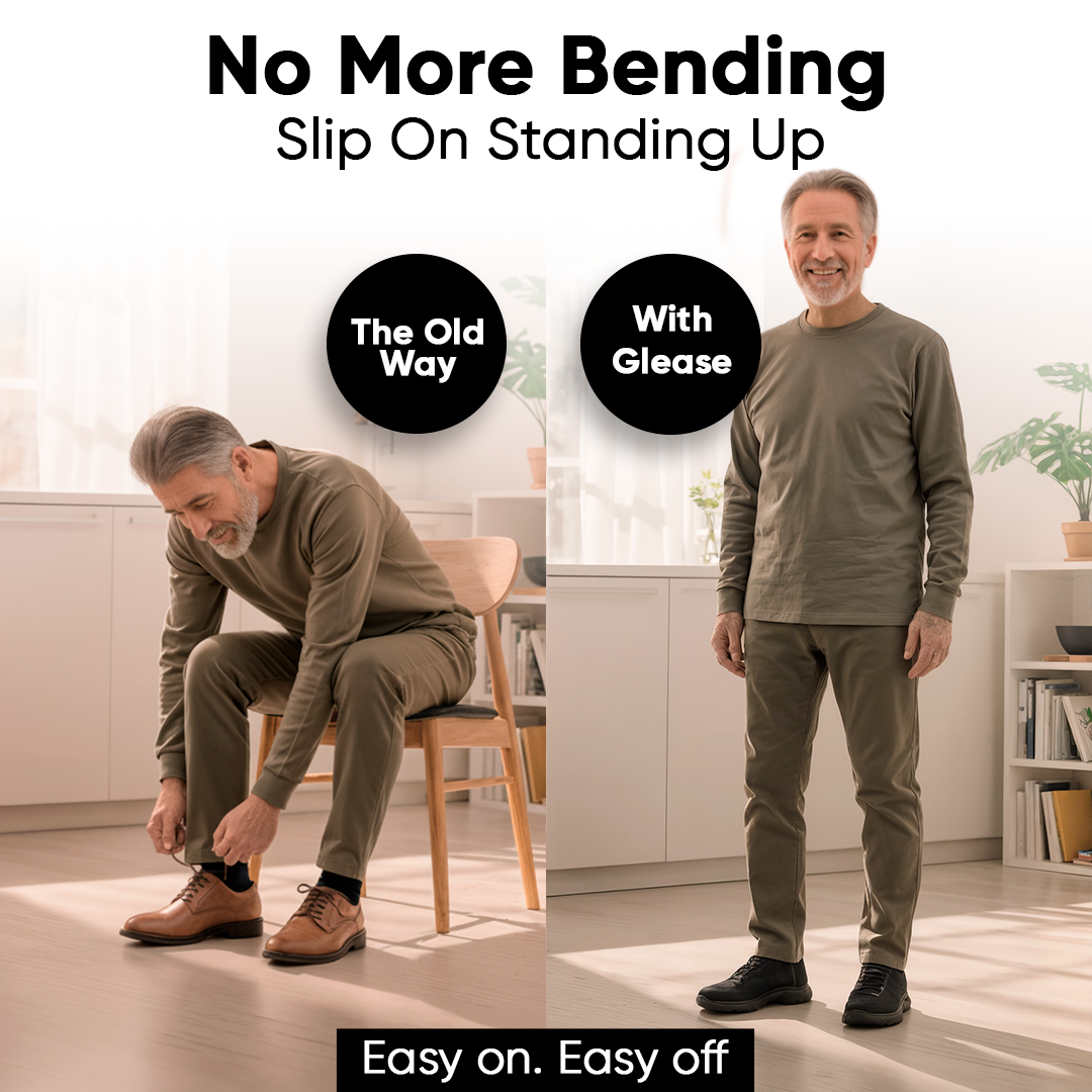 Every morning starts with that dreaded moment—staring at your shoes, knowing the pain that comes next. The sharp pull in your back. The wobble. The frustration. GLEASE changes everything. Just step in while standing tall. No bending. No help needed. Get ready on your own terms.