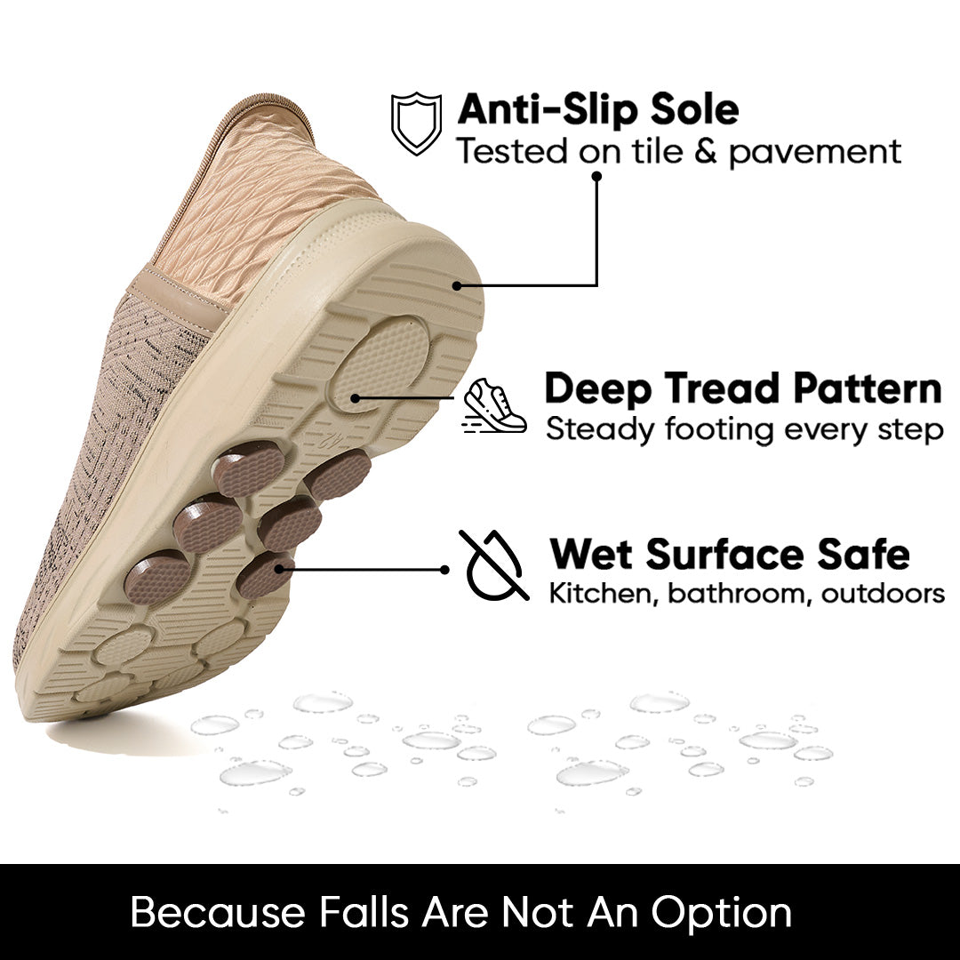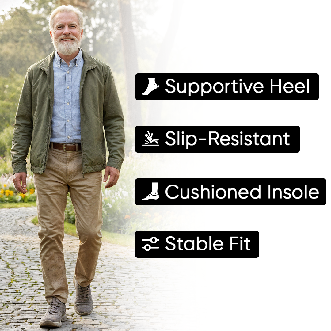 Falls steal independence. That's why GLEASE is built with safety first. Supportive heel collar keeps your foot secure. Slip-resistant sole grips wet surfaces. Cushioned insole absorbs impact. Walk with confidence knowing your shoes are working to keep you steady.