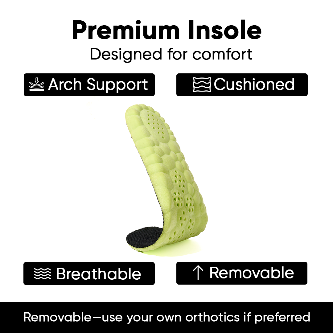 Easy means nothing if they hurt to wear. GLEASE includes a premium insole with arch support, cushioned padding, and breathable materials. The best part? It's removable. Use your own orthotics if you need to. GLEASE works with your feet.