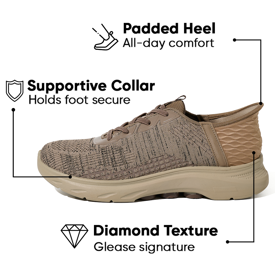 This isn't just another slip-on. Our Diamond Heel™ features a supportive heel collar that makes entry effortless. No collapsing. No crushing. Combined with padded cushioning and elastic laces, every element makes your life easier without compromising quality.