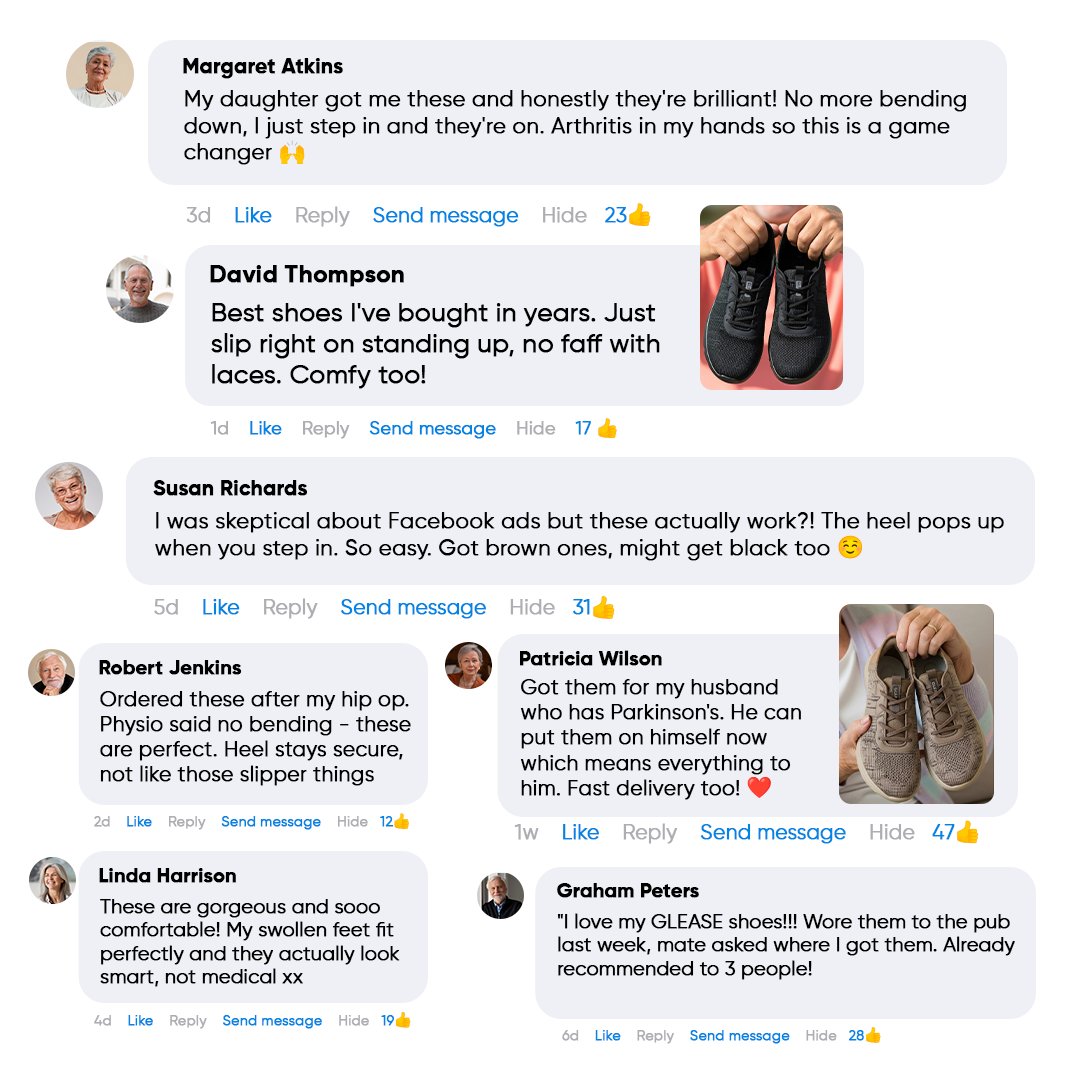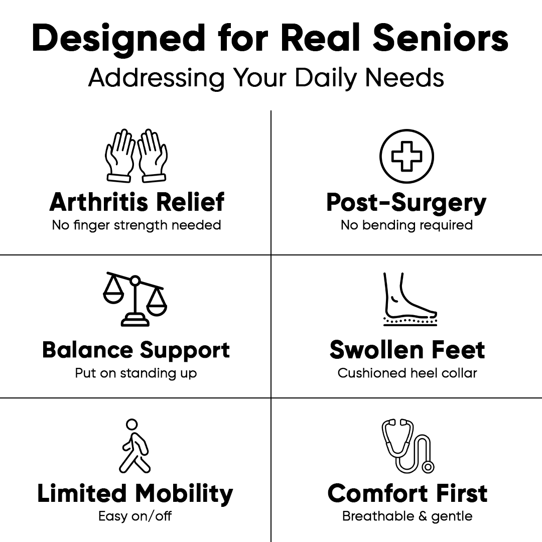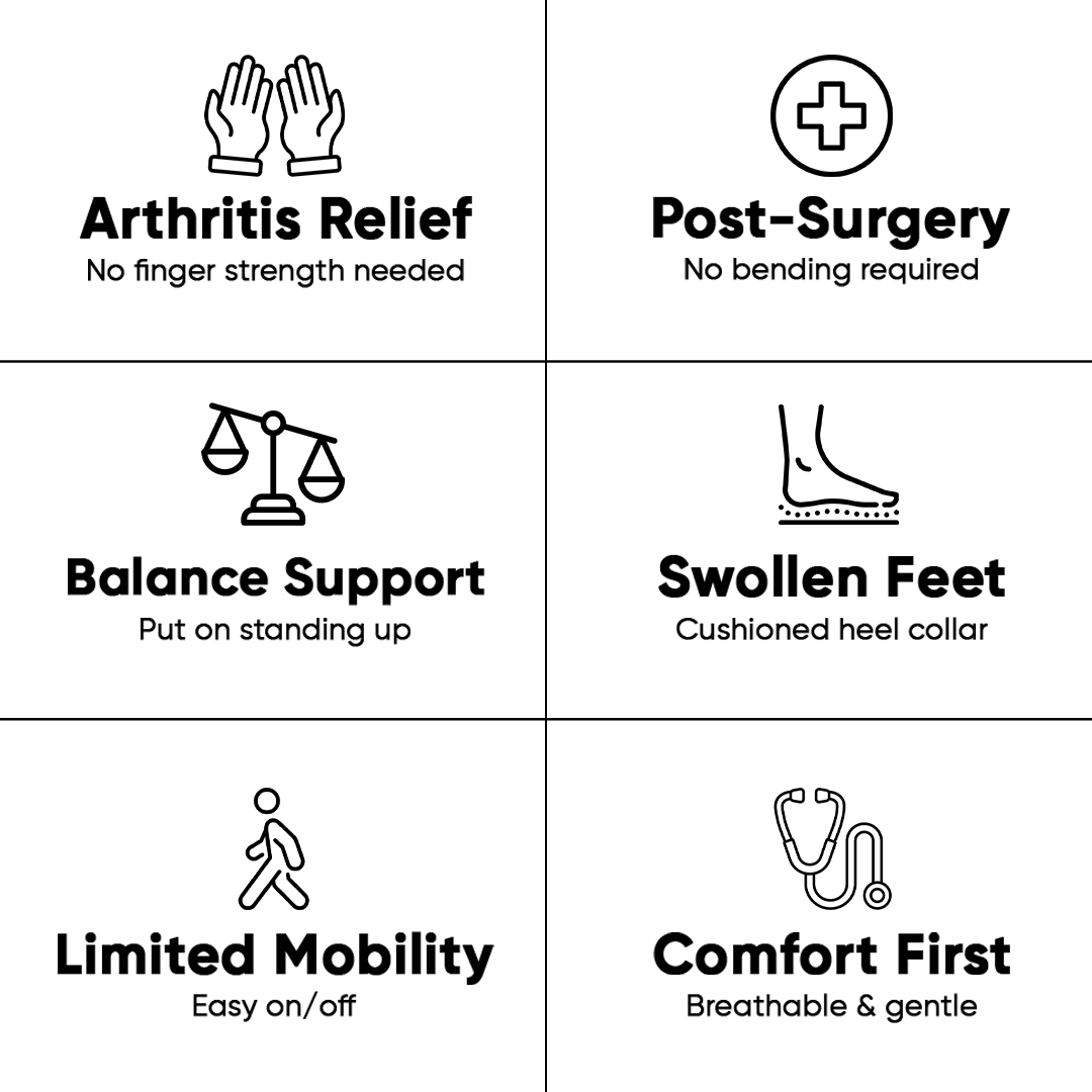 Arthritis. Post-surgery restrictions. Balance issues. Swollen feet. GLEASE was designed with all of it in mind. No finger strength needed. No bending required. Built-in support for balance. A heel collar that accommodates swelling. This isn't adapted for seniors—it's designed FOR seniors.